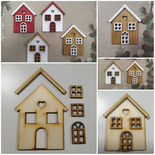 Jednoduchý tvar výřezu z topolové překližky o síle 3 mm ve tvaru domečku + dvě okýnka, dveře a stříška.