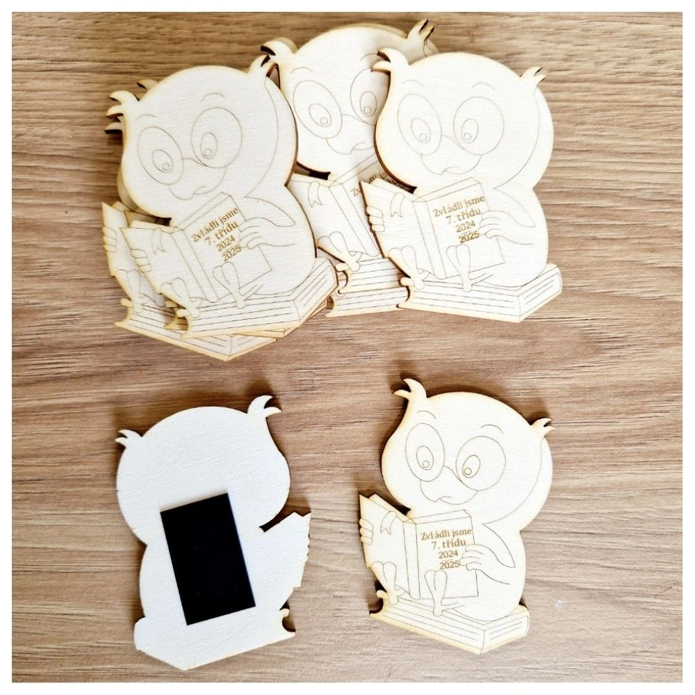 Magnet je vyroben z lehké topolové překližky, na přední straně má vygravírovaný motiv sovy sedící na knize a prostor pro vlastní nápis – např. "Zvládli jsme 1. třídu", jméno, rok nebo poděkování.