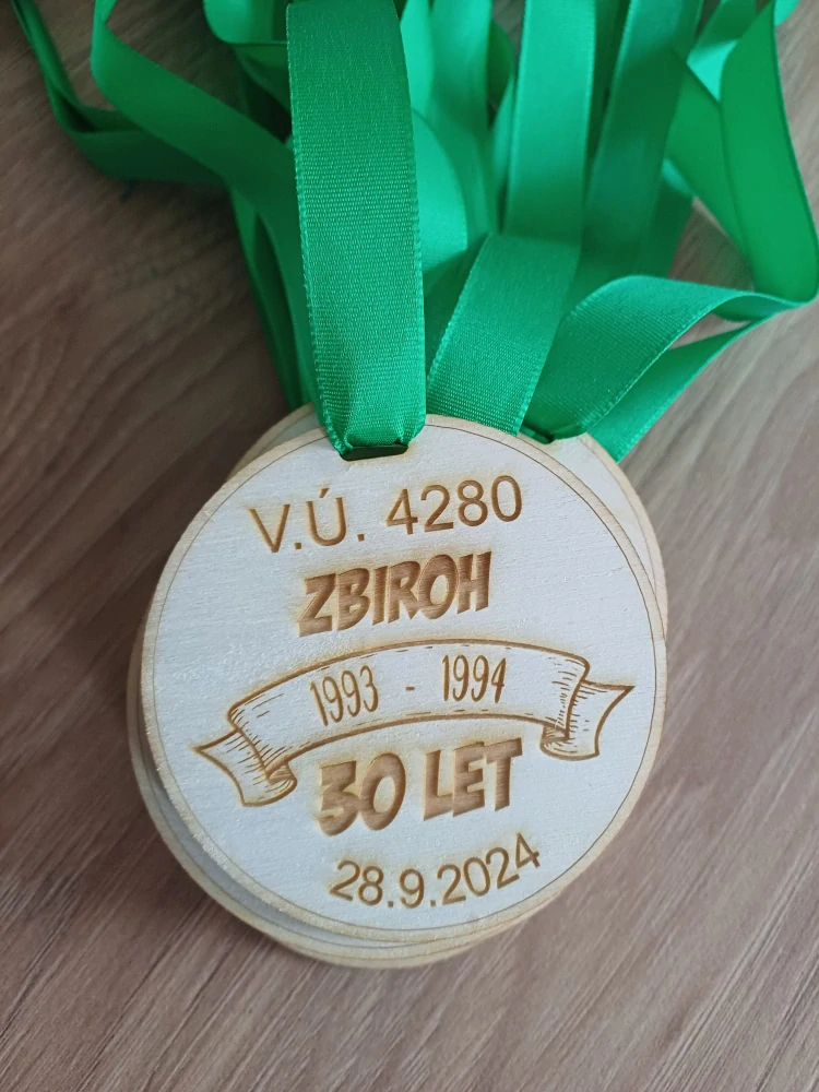 Medaile o velikosti 7 cm vyřezaná s topolové překližky o síle 3 mm.