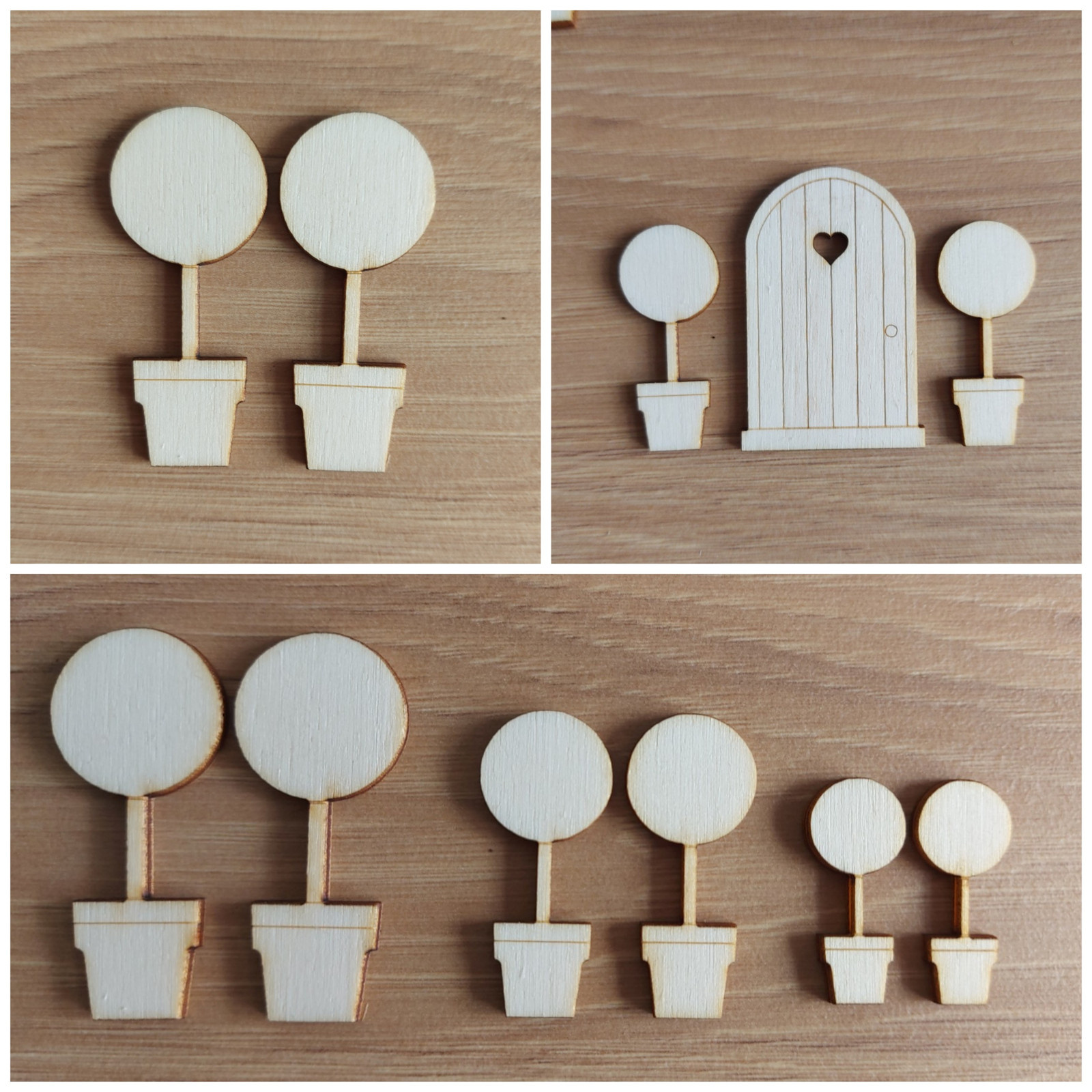 2 × malý překližkový stromek v květináči.